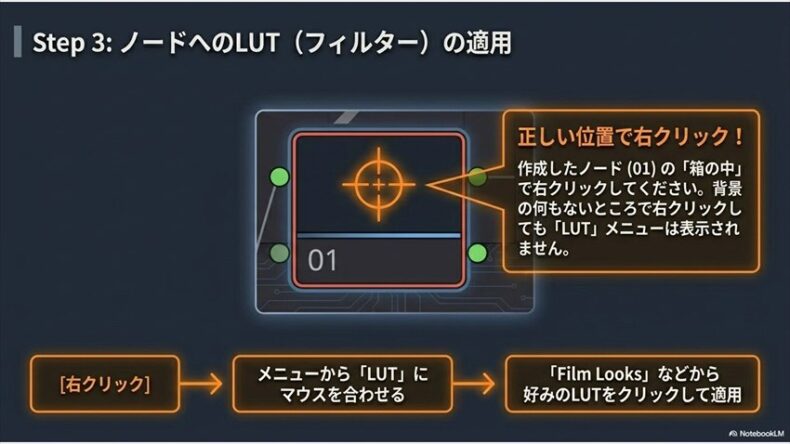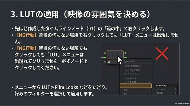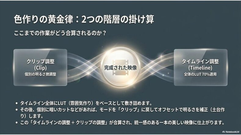 LUTはそのままでは効果が強すぎることが多いため、必ず「馴染ませる」作業が必要です。