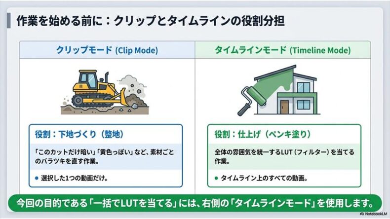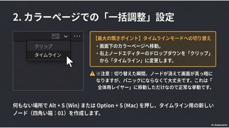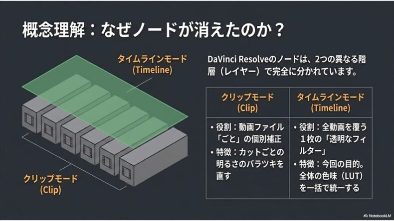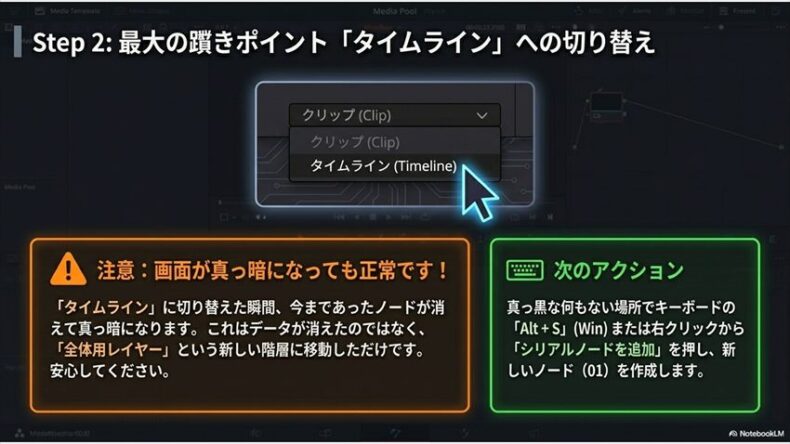 ⚠️ 警告:ノードが消えるのは正常です 「クリップ」から「タイムライン」に切り替えた瞬間、それまで見えていたノードが消えます。これは**「個別のクリップではなく、タイムライン全体に適用される上位レイヤーへ移動した」**ことを示す正常な挙動です。パニックにならず、次の手順へ進んでください。