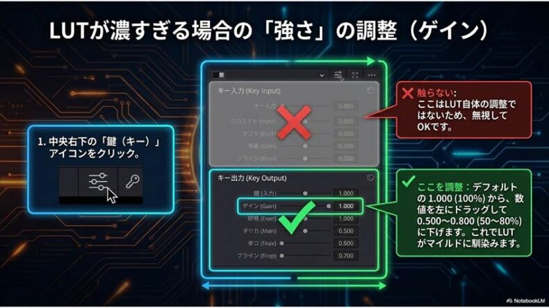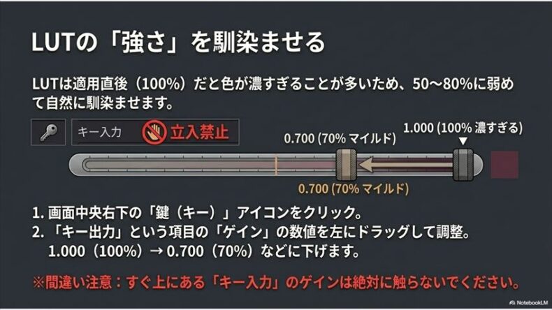 2. 「キー出力」セクションの**「ゲイン」**の値を下げます(例:1.000 → 0.700)。これにより、LUTの適用濃度を薄め、自然な質感にできます。