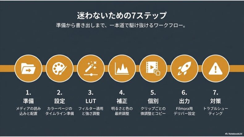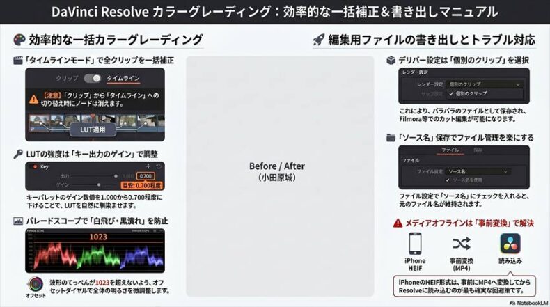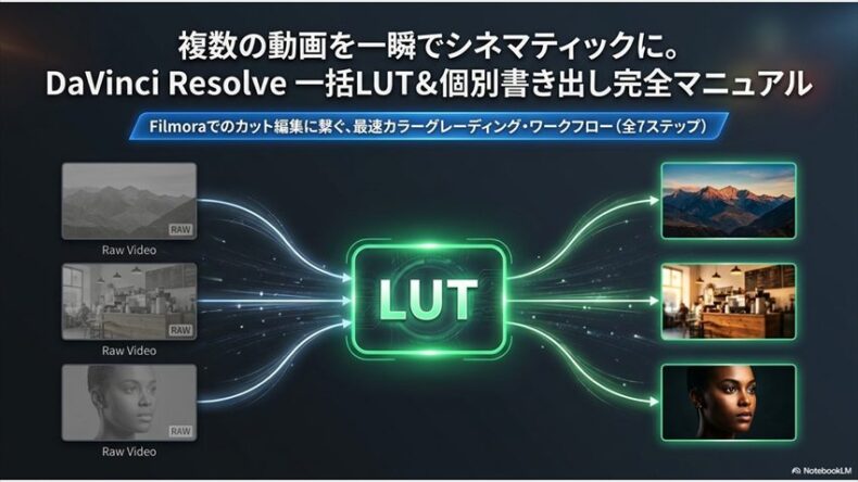 本マニュアルは、「Filmoraでのカット編集」を最終工程とし、その前処理(素材のクオリティアップ)としてDaVinci Resolveを活用するための最適化ワークフローを解説します。