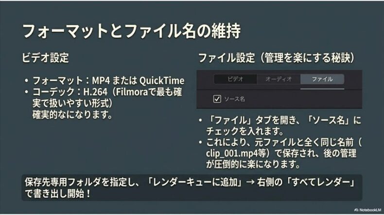 ファイル名 「ソース名」にチェック 元のファイル名と同じ名前にすることで、Filmora側での管理を確実にするため。