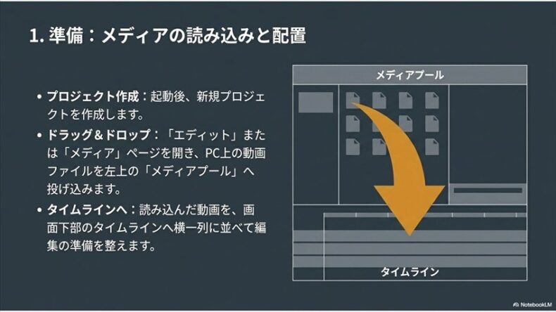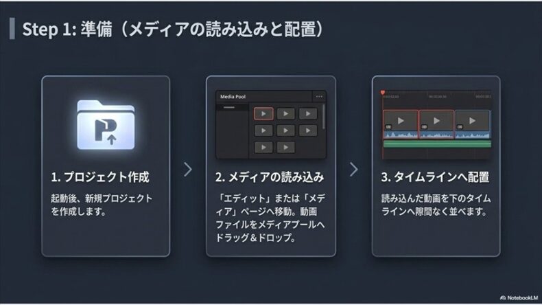 初心者、特にFilmoraユーザーが最初に直面する最大の「躓きポイント」は、DaVinci Resolveのプロジェクト管理手法です。