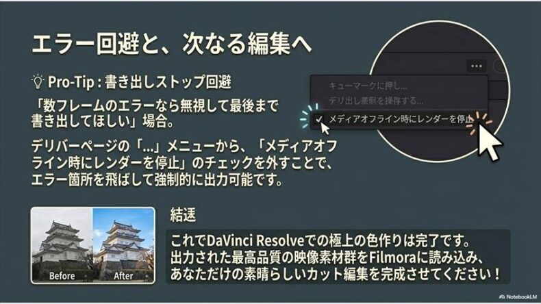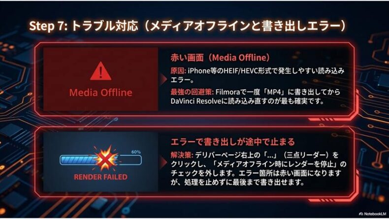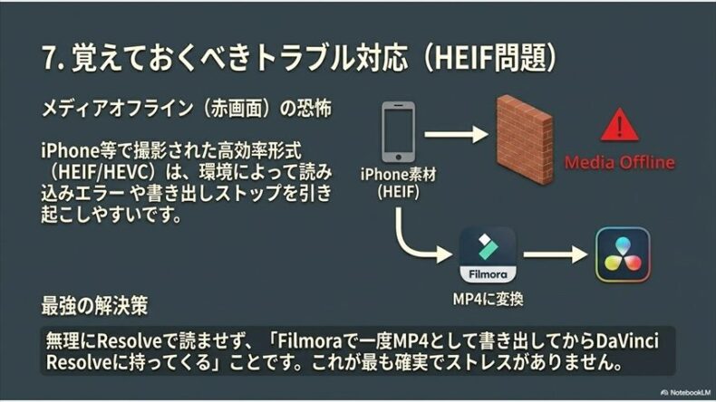 Q. iPhoneのHEIF形式などで「メディアオフライン」が頻発する A: iPhoneの「高効率」設定素材は相性が出る場合があります。この場合のみ、先にFilmoraで一度MP4にエクスポート(またはプロキシ作成)してからDaVinci Resolveに読み込むという回避策が有効です。