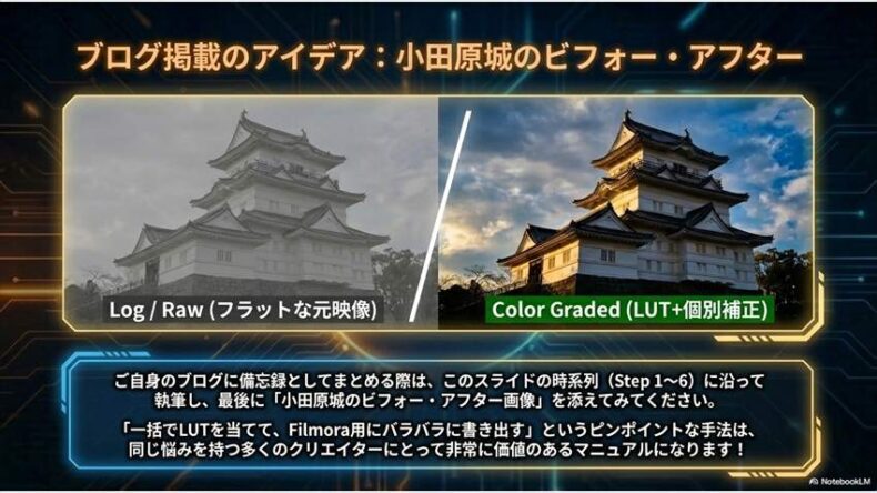 執筆者への最終アドバイス: 記事の末尾に「小田原城の補正前(Before)と補正後(After)の比較画像」を掲載することを推奨します。Resolveによる色彩の深みが、作品の価値をいかに高めるかを読者に直感的に伝えてください。