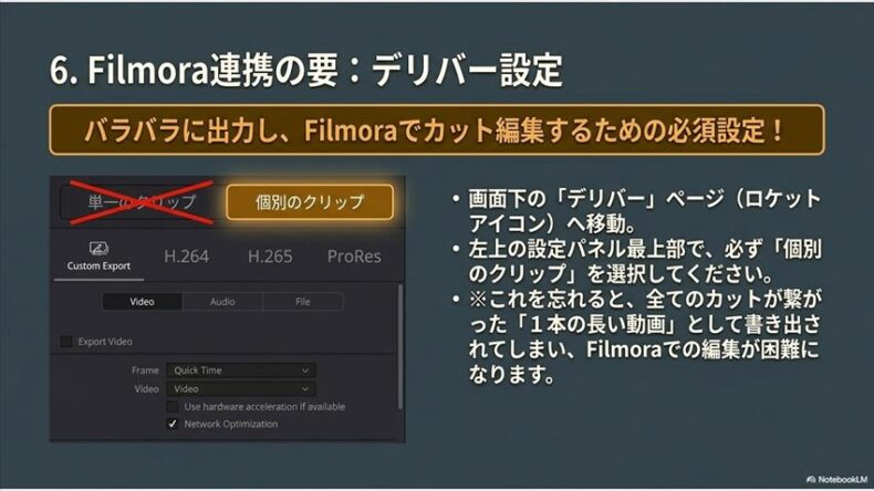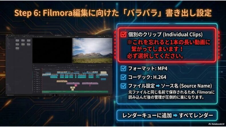 書き出し形式 個別のクリップ 最重要。 1本の動画にまとめず、カット単位で書き出します。