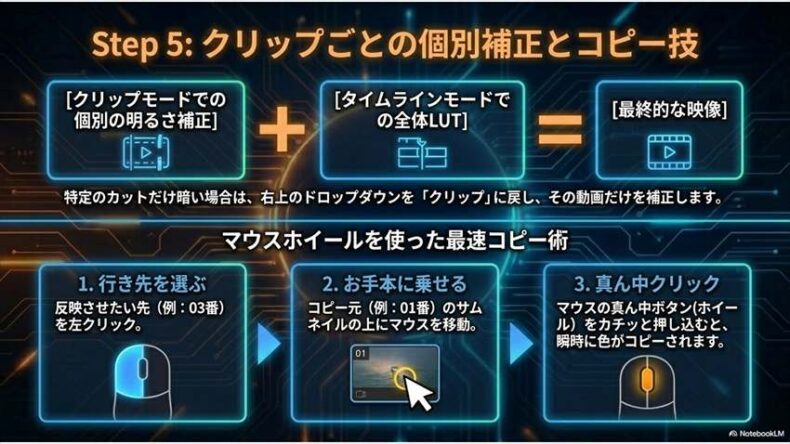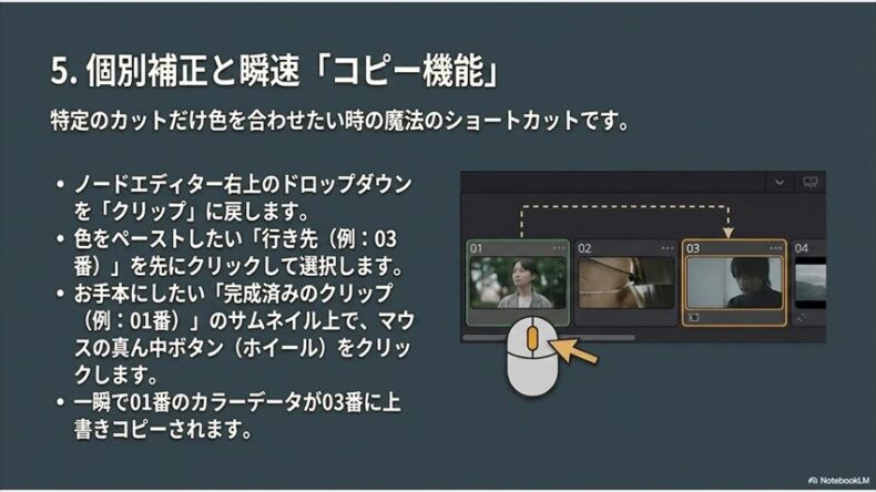 * すでに補正が完了している別のクリップへマウスを合わせ、「マウスの真ん中ボタン(ホイール)」をクリックします。これで瞬時に色情報がコピーされます。