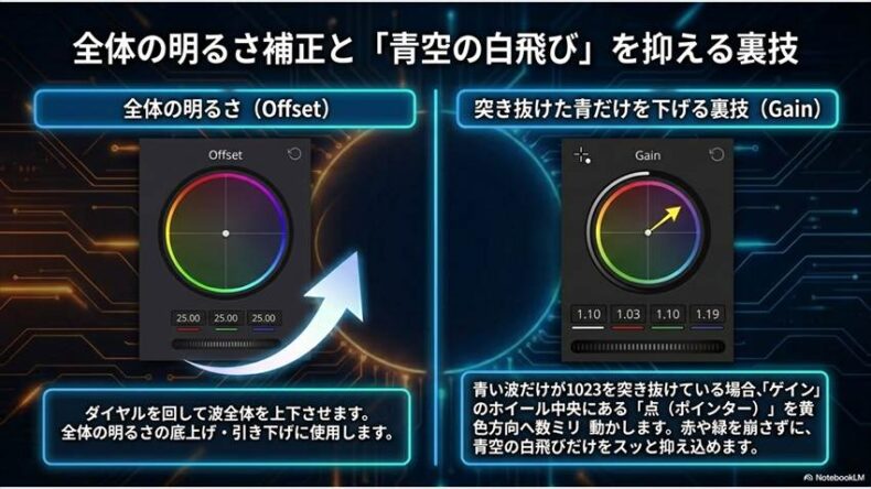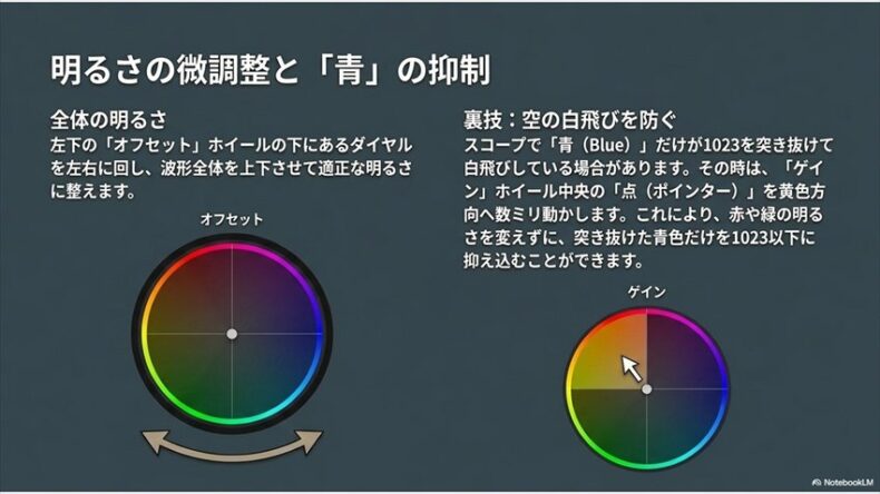 * ゲイン(Gain)ホイールの調整: プライマリーホイールの「ゲイン」中央にあるポインターを、**青の反対色である「黄色方向」**へわずかに動かします。これにより、ハイライト部分の特定の色(青)だけを1023以下に抑え込むことができます。